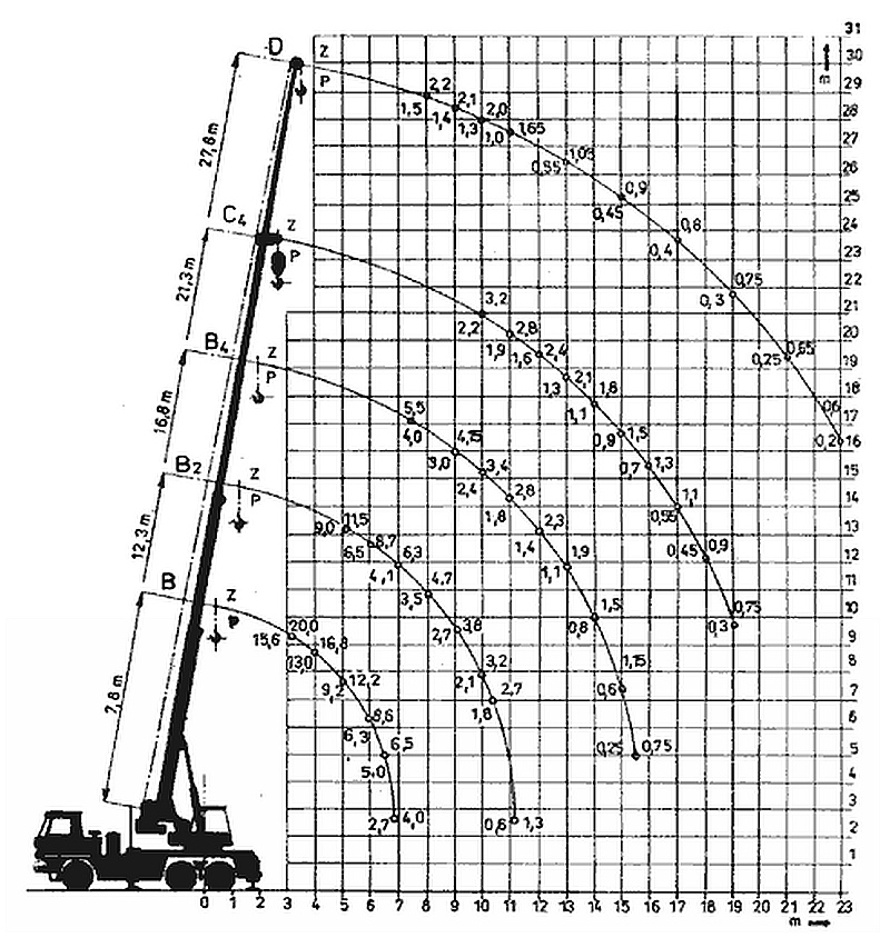 Pro dobrou ovladatelnost je jeřáb na podvozku s oběma řiditelnými nápravami a pohonu 4x4.
